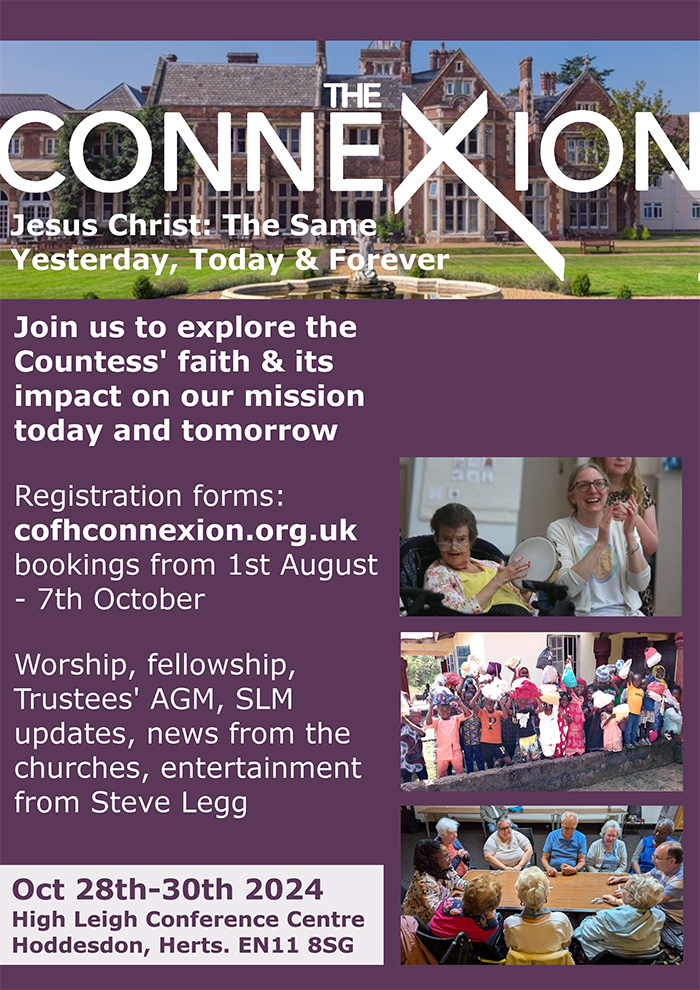 Paul Woodbridge will be looking back at the story of the Countess herself and her legacy for us, David Batchelor will be continuing to examine our articles of faith - this time turning to 'The Church' and what it means for us to be God's family today. Finally, Peter Earle will be looking forward at the mission God is calling us to.